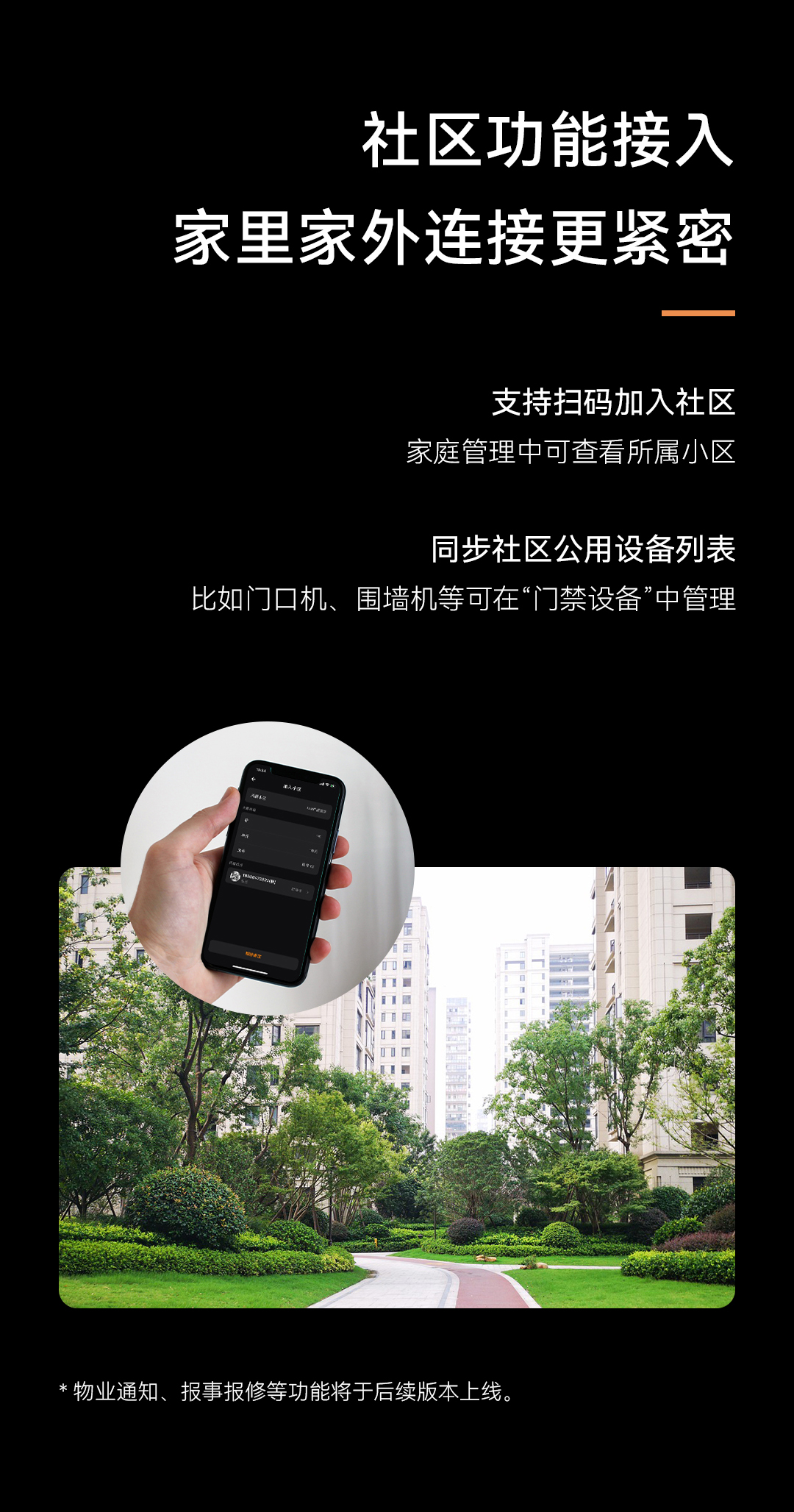 *物業(yè)通知、報(bào)事報(bào)修等功能將于后續(xù)版本上線。