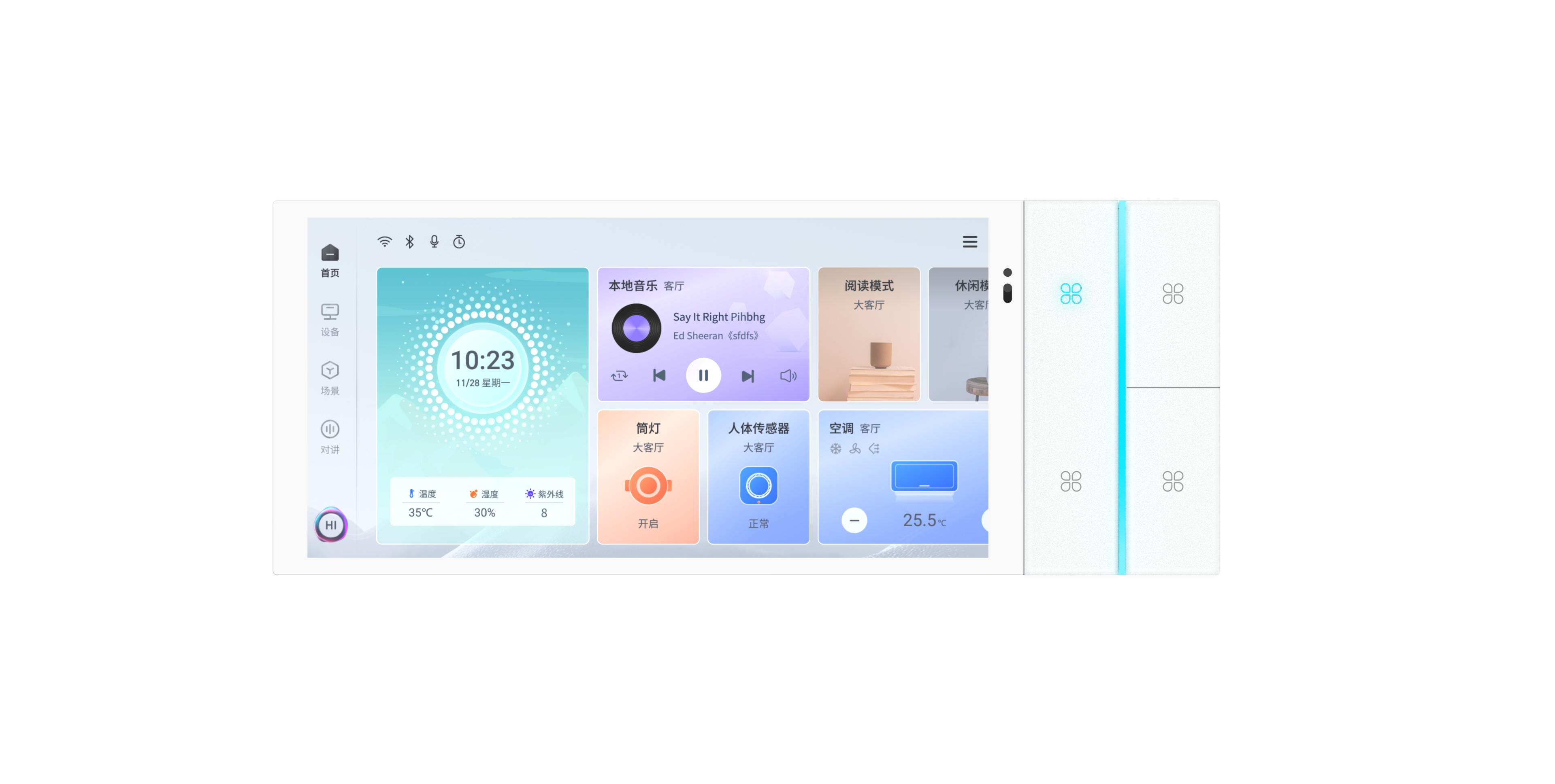 不滿足于單一的想象,S7智慧屏以“1+N”為外觀設(shè)計(jì)核心,即以6.9寸屏為基礎(chǔ),配備豐富的N部分可選模塊: 四鍵子面板、旋鈕子面板等,可進(jìn)行自由拓展安裝或替換。矜貴氣質(zhì),宛若天成。S7智慧屏如墻面上的藝術(shù)品,時(shí)尚、大氣,提升空間質(zhì)感。