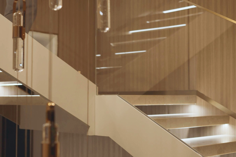 貫徹一層負(fù)一層空間的踏步燈帶旋轉(zhuǎn)梯,燈隨人亮,靈動智能,上下樓都有了別樣的趣味